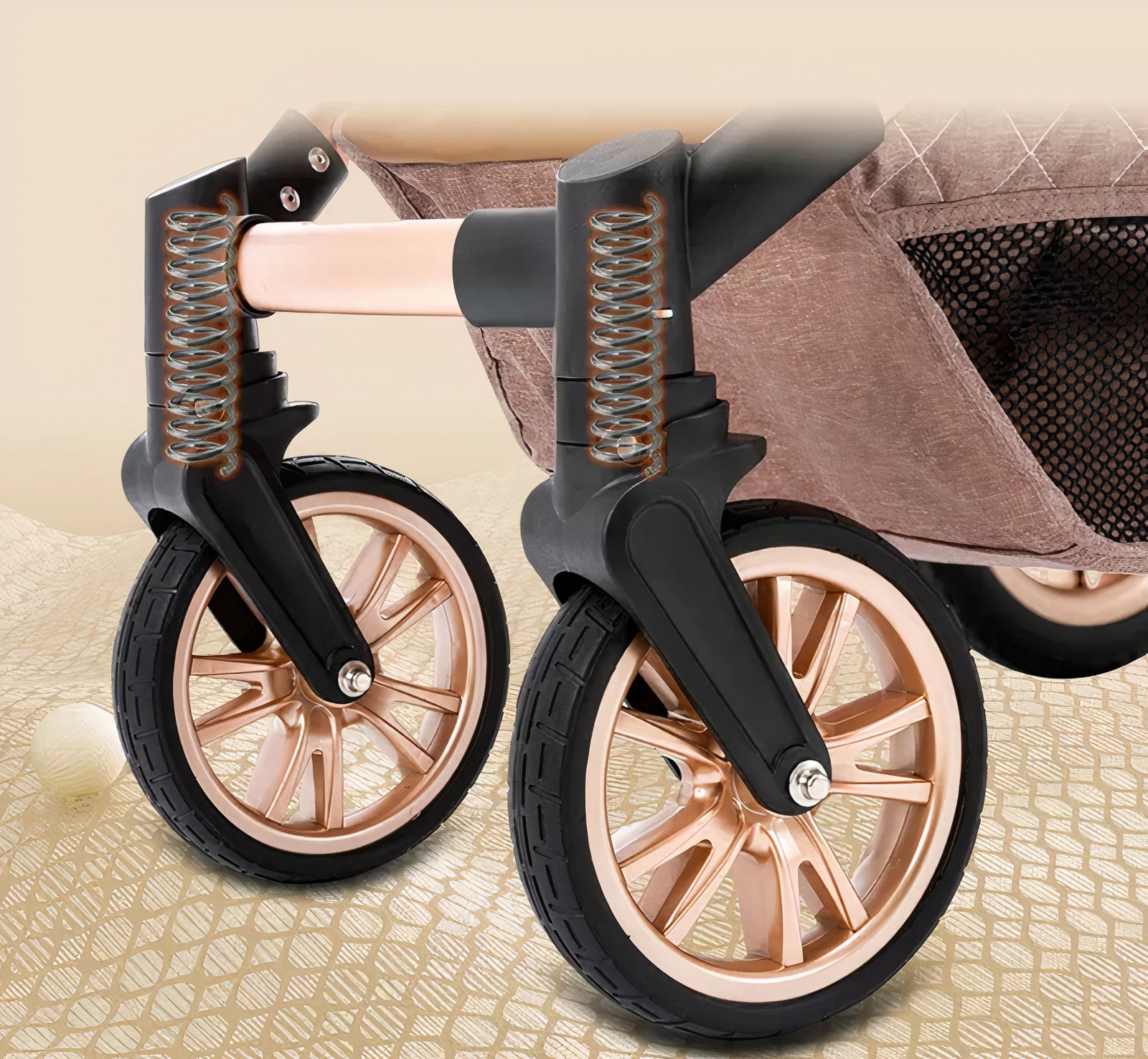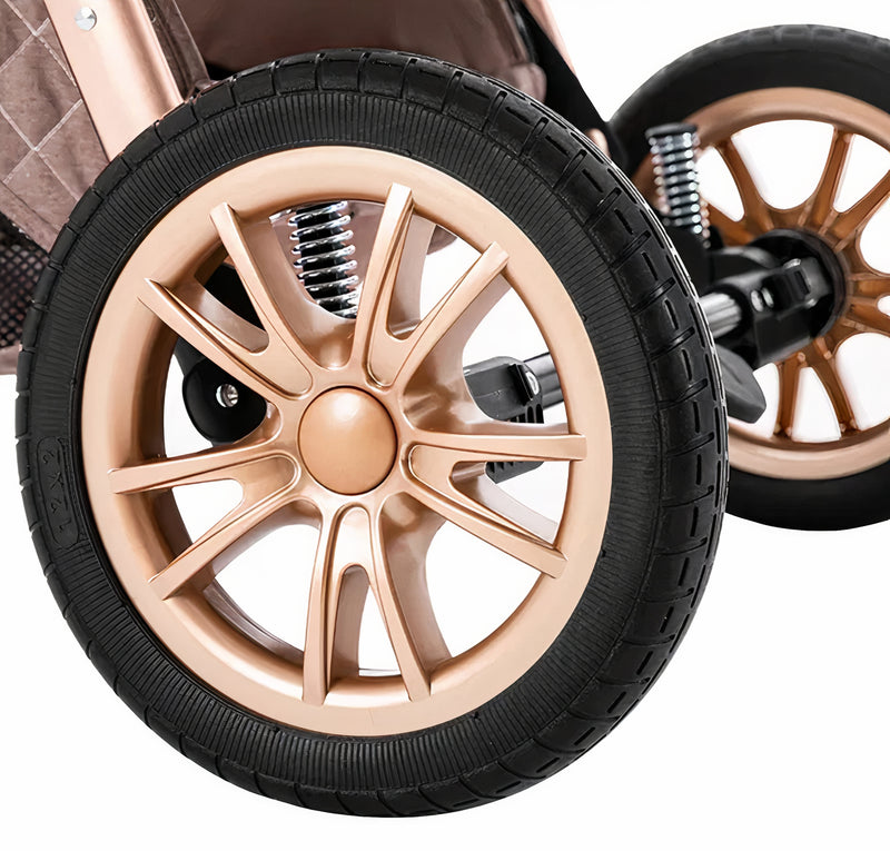Zažite najhladšiu jazdu pre vaše dieťa so systémom odpruženia na štyroch kolesách. Náš kočík bez problémov kĺže po akomkoľvek teréne, poskytujúc nedosiahnuteľné pohodlie. Od nerovných chodníkov po dobrodružné cesty, vaše dieťa si môže užívať jemnú a polstrovanú jazdu.