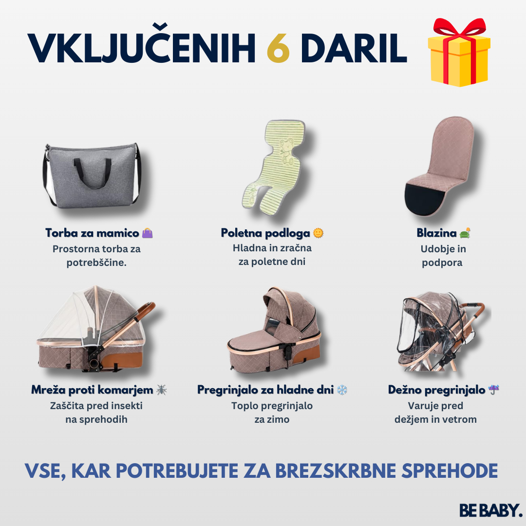 Pri nákupe dostanete bezplatnú dažďovú pláštenku, sieťku proti hmyzu, tašku pre mamičky a letnú podložku - všetko pre zlepšenie vášho zážitku z jazdy.